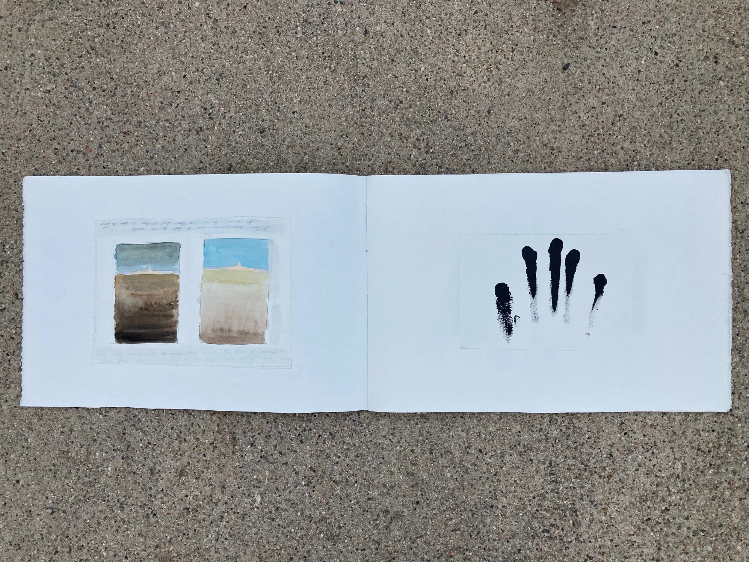 Returning to painting has required a shift in the way I think about my relationship to the land. I have to accept that my endeavor to go to the land for healing is the main narrative. I can’t represent the land without including this. So now I’m trying to represent the eternal in the distance. It still represents the nothing, the lack of existence, but now I’m included in the story, communicating with the nothingness. I am represented by human marks clearly made by my human hand.